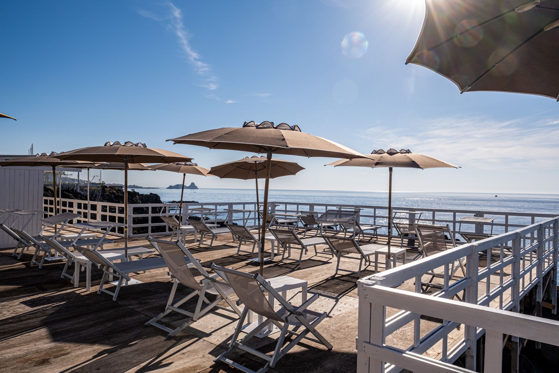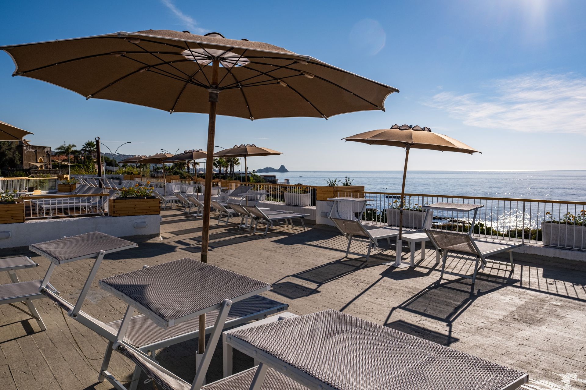 Il lido dispone di una meravigliosa terrazza panoramica con lo sfondo dei Faraglioni della vicina Aci Trezza, riservata agli eventi.