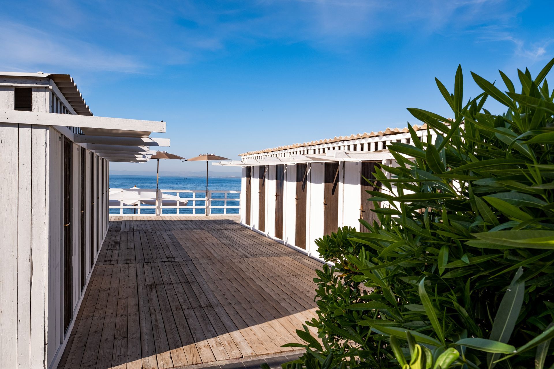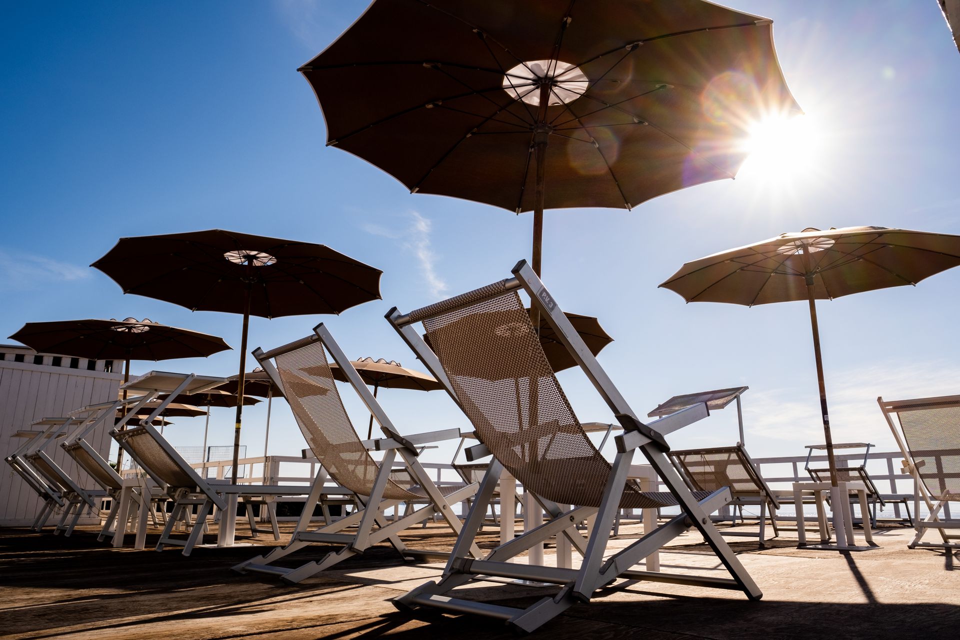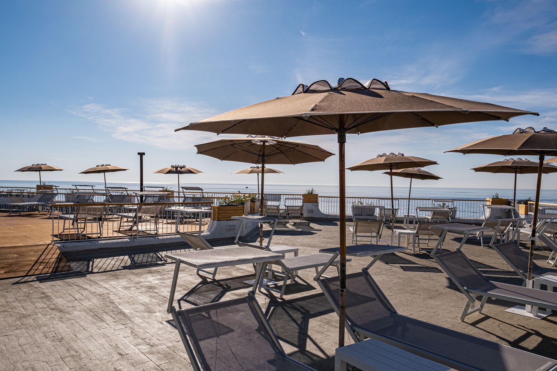 Solarium attrezzati con comodi lettini ed ombrelloni disposti in varie e diverse aree per soddisfare le esigenze personali di ogni cliente.